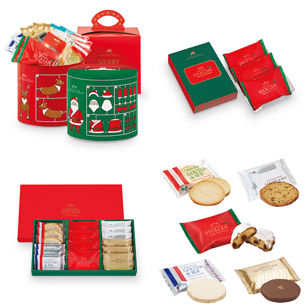 クリスマス限定品は『シュトレン』。個装の食べ切りサイズなのが注目ポイントです!!洋酒に漬けたドライフルーツやナッツをシナモン香る生地に混ぜて焼き上げ、バターと砂糖でコーティングしたクリスマスの伝統菓子なのですが、通常は大きな塊をみんなで切り分けて食べるものなので、同居家族がいないとなかなか買えないんですよね…ありがたい限りです。シュトレンを含む定番商品とのセットも充実。人気商品のクリスマス感あふれる特別パッケージセットも!