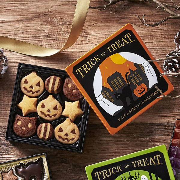 ハロウィーンデザインのオリジナル缶に、ハロウィーンキャラクター型のクッキーを詰め合わせました。さくさく食感のバタークッキーとリッチな味わいのチョコレートクッキーの2種類です。