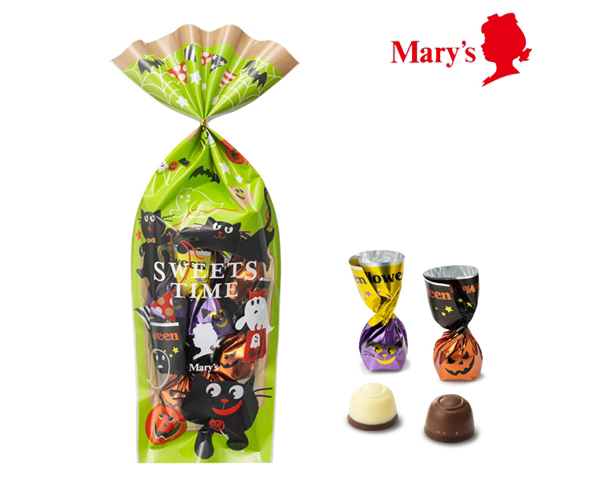 いたずらをたくらむ黒猫とおばけが描かれた袋に、おばけやカボチャの形をした二層のチョコレートを詰め合わせました。